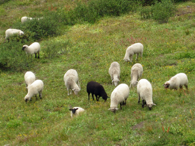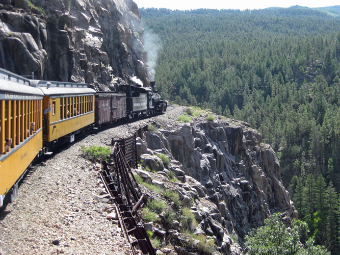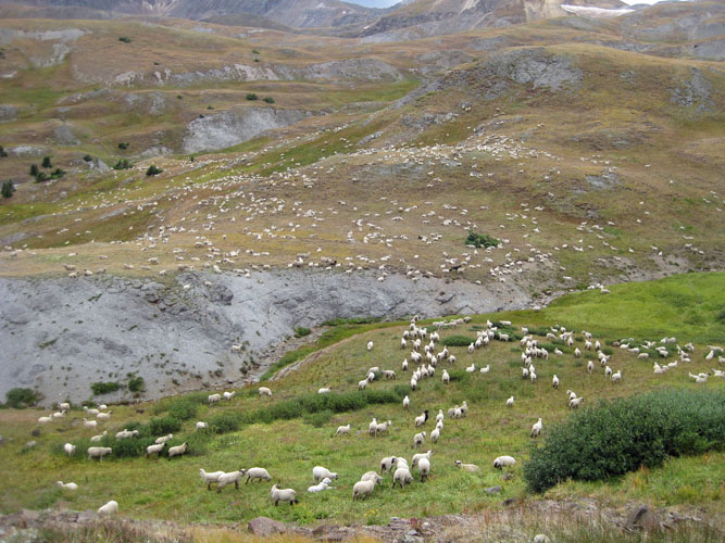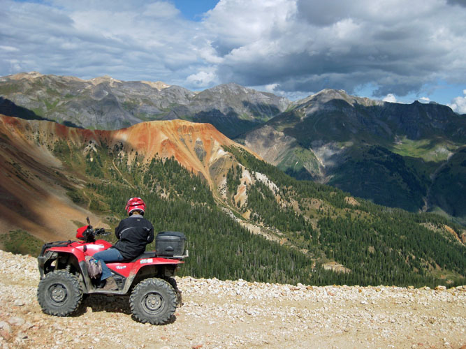 The third major stop on our tour was the scenic little town of Ouray to ride trails along the Alpine Loop in the San Juan mountains. Fortunately, we came into town from the north because the paved road coming into town from the south is NOT suitable for RV's. In fact, the thrill of driving US-550 south from town rivals some of the back country mining roads! And, as though the hairy highway and the dirt roads weren't enough, we also rode the world famous Durango-Silverton train ride which put our "environmental orgasm" over the top. The passes were much higher here, 12,800' to 13,100'. We (most of us) were glad our quads had fuel injection. This was a great place for wildlife, the highlight of which was a bear sighting (almost uncomfortably close to us). The cutest animals though were the sheep that fully covered the hillside on several occasions. Looking at them closer seemed to beg the question: "who's your daddy?".