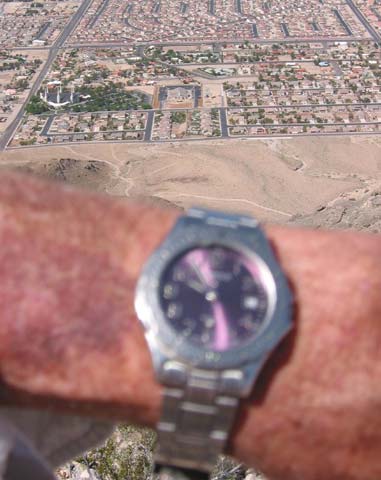 The canyon that we chose to ascend got steep very quickly and the loose scree made for treacherous footing. We worked our way along the side so we could have something to hold on to. Then we spotted a solid rock channel on the other side of the canyon and slowly worked our way across the scree to solid ground. The good news was that we were off the slippery scree. The bad news was that the rock channel needed to be climbed; not hiked! I commented that going down was going to be really dangerous. His response was "then keep going UP!" For a long time, we couldn't see the top and didn't know how much farther we had to go. Suddenly, we cleared a ridge and we were there. Howard had me take a picture of his watch to show that we made it up the 2,000 feet in just 2 hours.