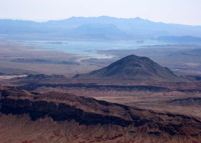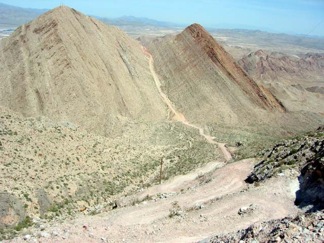 The view from the top was outstanding. We had been watching the Las Vegas valley all the way up, so the view of the lake and interim canyons with mining roads stopping half way up their ridges was a treat. The east side of the mountain is even steeper than the side we came up. It might not be shear, but you wouldn't do much more than bounce for the first 2,000 feet. Our first order of business was to hike along the ridge so we could add a rock to Roger's cairn. Then it was back past the towers to bag a geocache. Howard found a comfortable perch while Bob logged the cache.