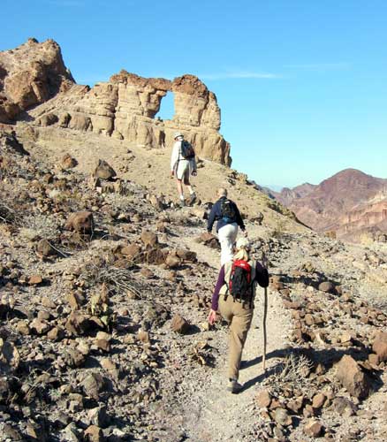 Liberty Bell Arch is in the Lake Mead NRA. It is a 5 mile round trip with 100 feet of "net" gain that comes in the form of maybe 500' down and 600' up. From the parking lot we could clearly see our destination, an overlook 1,000 feet above the river, and the formation that holds the arch.