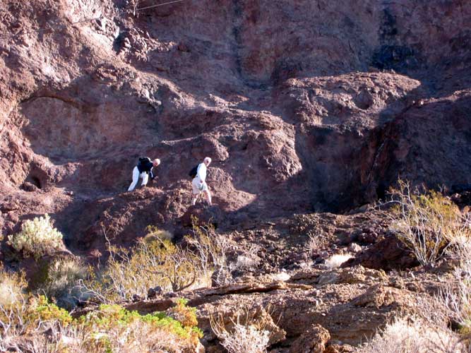 Our final ascent to the viewpoint was rewarded with the contrasting colors of the green river flowing through the dark rock of the canyon. This has to be one of the most spectacular views in Las Vegas. We had lunch at the edge of the cliff 1,000' above the Colorado River and watched as a couple of boats disturbed the mirror-like surface of the water.