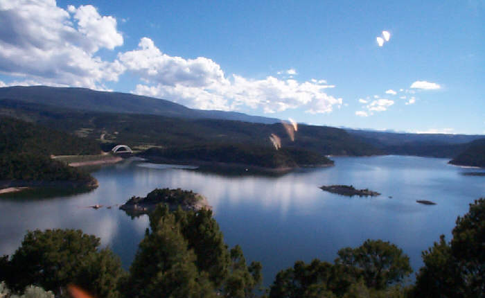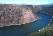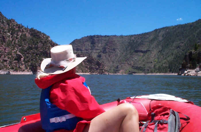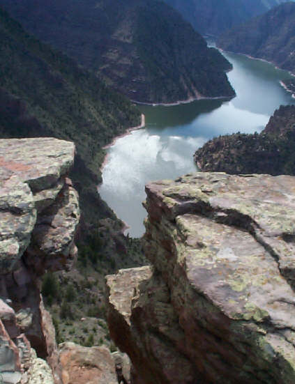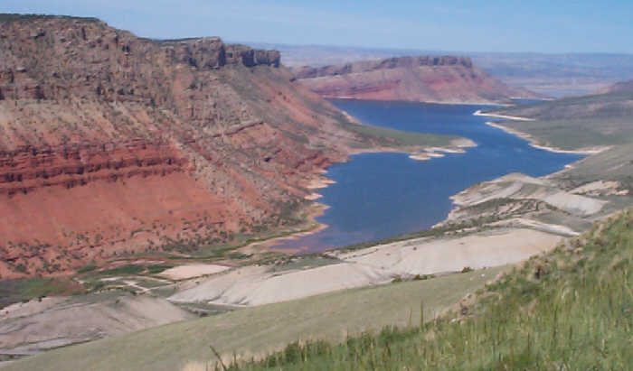 The lake is 90 miles long. We broke out the Zodiac and motored 13 miles up the canyon to the spot we were viewing from the visitor center. The Utah part of the canyon is spectacular with high walls and creeks running into the lake from every side canyon. The Wyoming part is a little less dramatic; mostly bare but colorful hills.