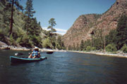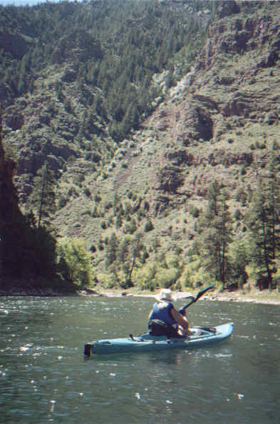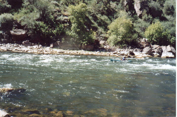 We put-in just below the spillway and floated with the (strong) current through a long gorge below the dam. We were admiring the the bright pink rocks that gave the gorge its name and almost didn't notice the first rapid, which we negotiated without a problem. The name of the first rapid, by the way, is Anticipation (as in anticipation of the second rapid - aptly named Deadman). The second rapid is a true class 3; the worst on this part of the river. A man and his young son were in front of us in a rented whitewater kayak. Patty and I held back to see which route they were going to take through the rapid. All of the sudden, they dropped out of sight! When they got far enough from "the lip" that we could see them again, their kayak was bouncing like a rocking horse.