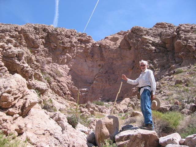Since we didn't (couldn't) return the way we came up, we decided to try hiking down a canyon that began at the low point of the road to the towers. The wash looked promising for the first 3/4 mile; we even came to a 30' dry fall and found an easy way around it. Then, just when we thought we had it made, the canyon narrowed between sheer rock walls and the bottom dropped out at another dry fall with no way around. Howard was sure that we could go over another ridge or two to find a passable canyon. Since we were dangerously low on water, I insisted that we retrace our steps and return via the road. It would be a LOT longer but at least it was a "known" route. I kept thinking about those guys who died last year hiking out of the hot springs and didn't want to chance running into another "dead end" (excuse the pun).