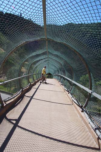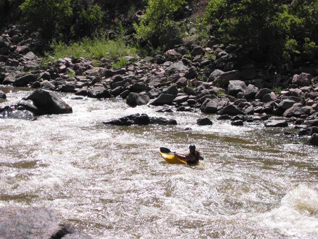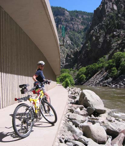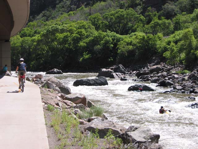 We broke out the bikes and were crossing a bridge on the trail first thing in the morning. Glenwood Canyon is quite narrow. The Colorado River runs through it and leaves little room for anything else. Somehow the engineers have stacked Interstate 70 (separate east and westbound lanes), a railroad, and a bike trail alongside a river full of kayakers. We stopped to watch them and one guy managed to wipe out. As in: now you see him; now you don't!