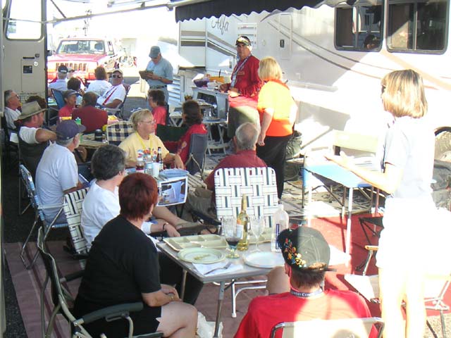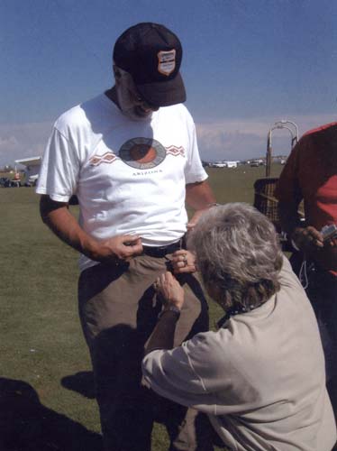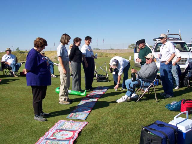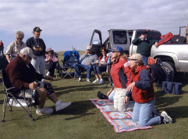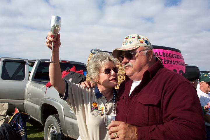 The next order of business was returning to the field for a ceremony inducting first-time flyers into the elite club of balloonists. Bill would break out a "prayer rug" and recite the balloonist's creed before pouring the Champaign. The initiates had to kneel on the prayer rug and pick up the plastic glass full of Champaign with their teeth, drinking it down with no hands. Next came the "pinning" where Bill or Darlene would pin a balloon emblem in an area of their choosing. When the ceremony was finished, the FIRST happy hour would begin (at 10 o'clock in the morning!). An hour or so later, we'd head back to our rigs for some rest (or a bike ride) before the NEXT happy hour started at 4 PM. The second happy hour was designated as a "mandatory" meeting to disseminate plans for the next day.