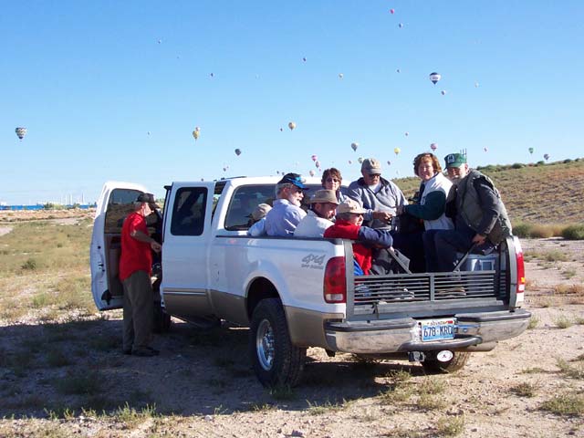 Having "our own" balloon allowed us to be part of the action instead of just being spectators. Ballooning is not a solitary sport. There are arguments about how many crew members it takes to manage a takeoff and landing. We generally had about 20 people in 2 chase vehicles, and each of us was "involved'. Our balloon pilot, driving chase vehicle #1, would leave for the field every morning at 5:45 AM to attend the pilot briefing and find out what the weather had in store. The rest of the crew would pile into BobnPaty's truck (chase vehicle #2) at 6:30AM and head for the field to begin the setup process. As we were climbing into the truck, we could see the Dawn Patrol floating by in the pre-dawn darkness.