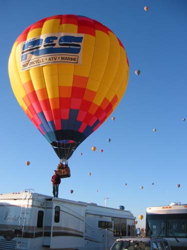 We belong to an RV organization called Escapees, and to an unstructured subgroup within it called the Boomers. The Boomers are a (comparatively) younger group of RV'rs that are activity oriented. One of the Boomer couples (Bill & Darlene) owns a balloon named $hebrokeu$. Another Boomer couple (Craig & Terrie) organized a get-together (called a Boomer-rang) at the Fiesta (in this case, a Ballooner-rang). We had about 8 rigs in the core group with others coming and going during the 10 day event. We arrived in Albuquerque a day early (September 30th) and were assigned a terrific campspot with an unobstructed view directly under the takeoff path. The balloons passed by us flying so low that we had to lower our TV antennas.