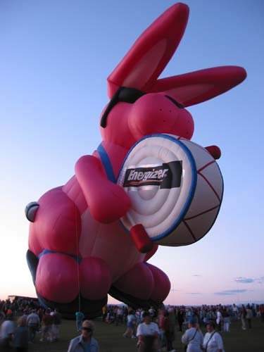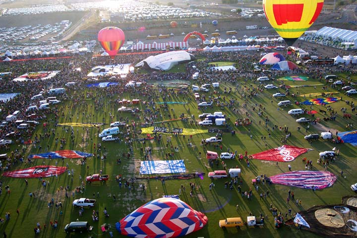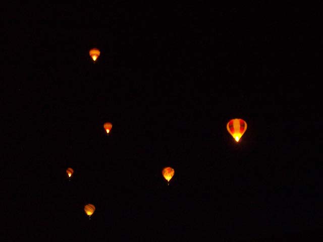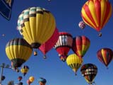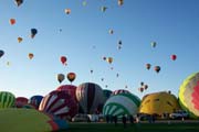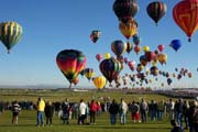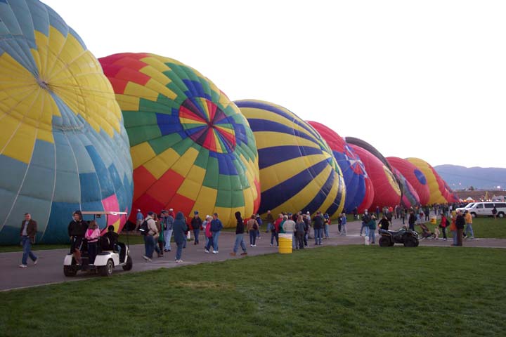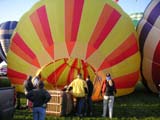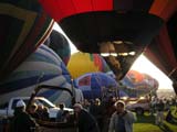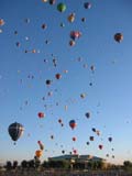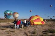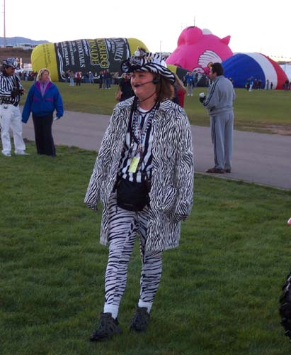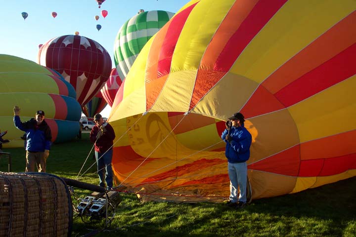 The activity on the launch field was extremely well organized. A balloon miester officiates at the pilot briefing and determines if the weather conditions are right (we didn't fly on 2 of the 10 days). Officials (called zebras) roam the field dressed like football referees in outrageous costumes. Their job is to tell the balloons when to begin inflating and when to launch. It is really beautiful to see a dozen huge balloons side by side, all at the same stage of setup or inflation. The launch field is huge, with at least 30 rows and 11 station in each row; we were assigned launch station J-11. There were two launch waves with about 350 balloons going up in each wave. The balloon we were supporting, $hebrokeu$, always launched in the first wave. The sight of so many colorful balloons lifting off at the same time is truly awe inspiring, particularly when viewed from inside one of the ascending balloons!