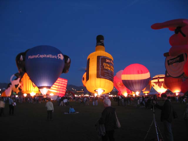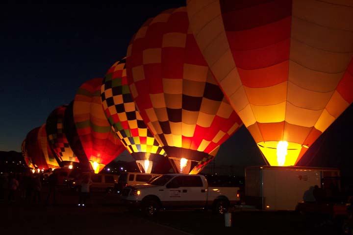 Not all balloons are built in the same shape. The most unique ones are classified as Special Shapes and get special launch considerations. Walking among them as they're inflating is an experience not to be missed. Another beautiful aspect of the Fiesta is the Balloon Glow (called a Glowdio). On assigned nights, a whole field full of balloons are tethered to chase truck bumpers and inflated with just enough hot air applied to keep them standing straight up. On the command of the balloon miester, every balloon activates its burners to make the envelope glow. Whether you're watching it from right up close or far back, the view is spectacular!