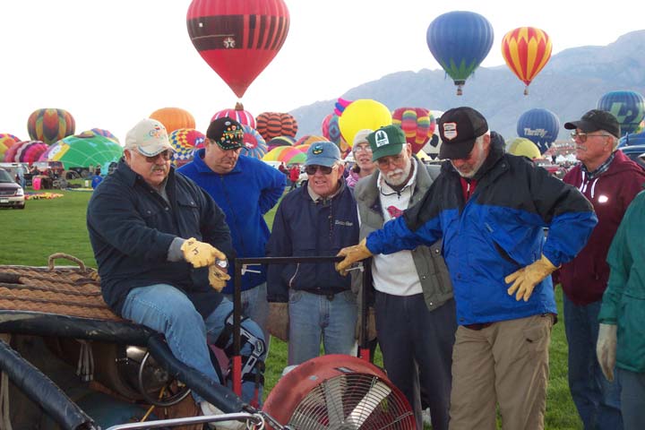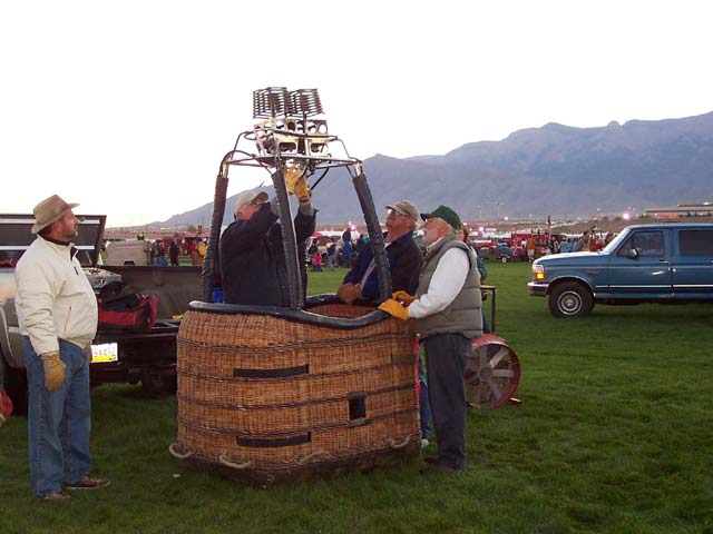 Setting up the balloon required gloves and instruction. Each morning, our job as crew would entail taking the (500 pound) basket off Bill's truck and erecting the framework that holds the burners. Next we would take down the bag containing the envelope (balloon) and walk it out to its full length. After making sure that the correct load straps were on top, we connected the envelope to the basket with 4 locking carabiners. Then two of us would hold open the mouth of the envelope while another would start a gasoline powered fan and direct the airflow through the mouth to inflate the balloon. This was a COLD job in the early morning at Albuquerque's elevation of 5,000 feet! Once the envelope had filled, the pilot would get into the basket (which was still laying on its side at this point) and press the burner triggers to shoot several blasts to heat the air in the envelope and make it stand up (lifting the basket into an upright position). He would then perform a series of preflight checks which Bill called his "magic pilot shit". The passengers would then climb into the basket and the pilot would shoot (a lot) more hot air into the envelope while a bunch of us were acting as ballast (called "weight on"), holding it down and keeping it from drifting. Soon the balloon would rise and the "chase" was on.