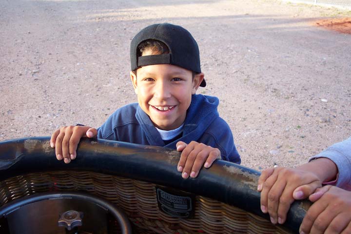 Each of our two chase vehicles had a driver and a navigator. The navigator's tools were a detailed road map and an FRS radio. The pilot would watch where the winds were taking him and look for an empty spot to put her down. Meanwhile, the two chase vehicles were trying to guess which landing area he was heading for and were competing to see who would reach the landing spot first. By tradition, the next person to fly comes from the first chase vehicle to arrive. Hopefully at least one of the chase vehicles would be there waiting when the balloon touches down. If the winds are at all strong, the balloon is going to be dragged along the ground until people grab it and apply weight-on. Everyone helps with weight-on; especially if the chase crew doesn't get there before the balloon lands (which is the usual situation). On Patty's flight, a bunch of strangers ran up and grabbed her balloon. She took a picture of one of the young kids happily acting as ballast.