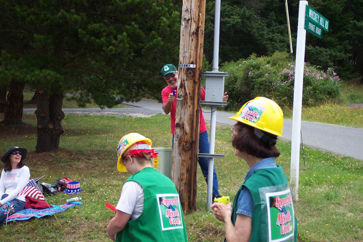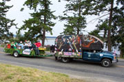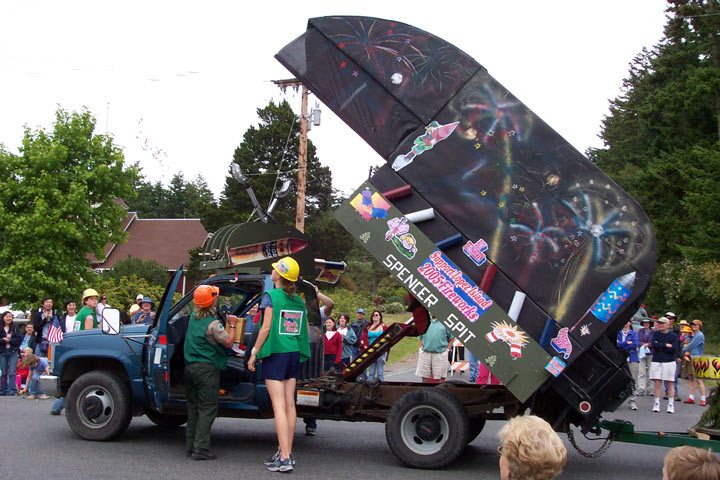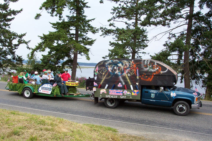The island doesn't get a lot of visiting tourists, at least not by California/Nevada standards. Fourth of July is the season's busiest holiday, and the only day (so far) that our 30 camping spots were filled. The park entered a float in the 4th of July parade (I think half the people on the island were in the parade). Our float was built on the Park's dump truck. Every now and again the truck would stop and the performers would jump off to line up in formation brandishing their water guns. The bed of the truck would rise to expose a catapult that would then launch candy into the crowd. Bob's job was to attack the formation as they returned to their duty stations. We were all soaked from the water gun battles.