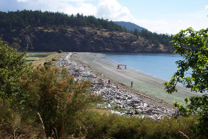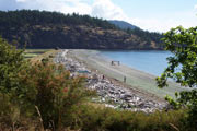Spencer Spit is a triangular-shaped sand spit that juts into the channel between Lopez and Frost islands. It is at least 1/4 mile long and stops about 100 feet before reaching the other island. They say it will never reach the other island, however, because a strong tidal current rushing both ways through the channel scours it clean. A lot of boats moor off the spit and the people use their dinghies to come ashore. Several walk-in camp spots are located at the base of the cliff that are often occupied by boaters looking for a little land-time.